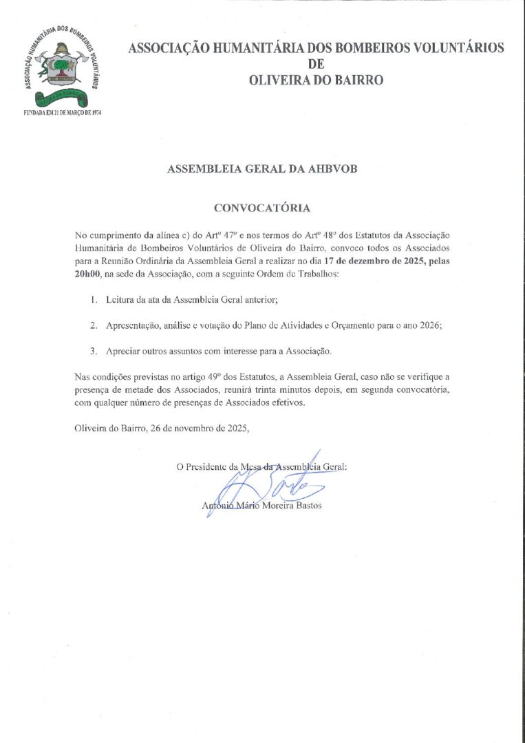 No cumprimento da alínea c) do Artº 47º e nos termos do Artº 48º dos Estatutos da Associação Humanitária de Bombeiros Voluntários de Oliveira do Bairro, convoco todos os Associados para a Reunião Ordinária da Assembleia Geral a realizar no dia 17 de dezembro de 2024, pelas 20h00, na sede da Associação, com a seguinte Ordem de Trabalhos: